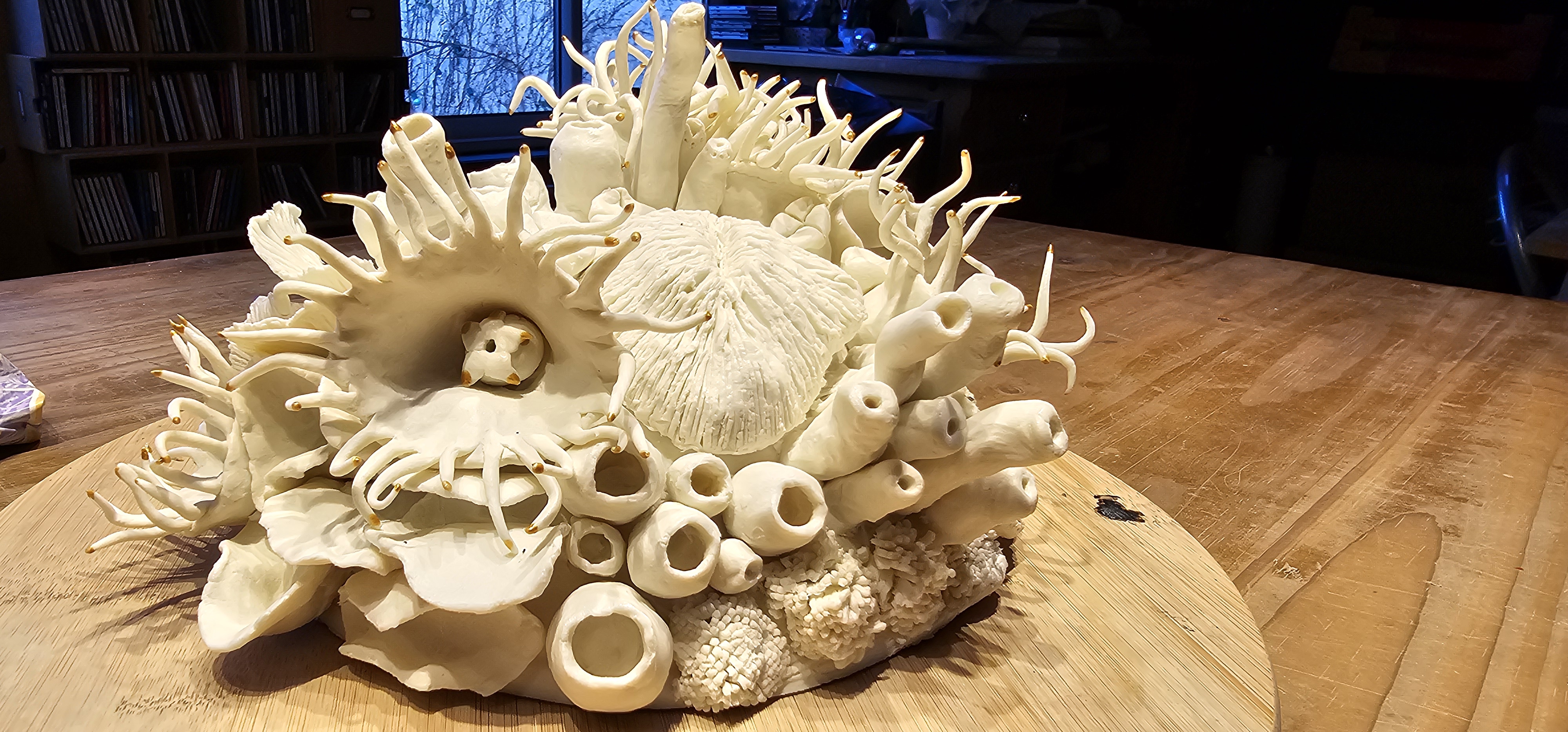 Je m’inspire de la nature, tout autant terrestre qu’aquatique par une observation souvent macroscopique. Mes créations rappellent des végétaux marins, les sous-bois, je travaille depuis les graines au pollen et du pollen à la cellule.
